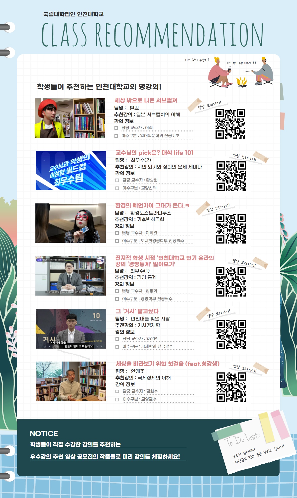 학생들의 입장에서 인천대학교의 2020학년도 우수 강의를 추천하는 영상 공모전의 제작 결과물을 공개합니다.