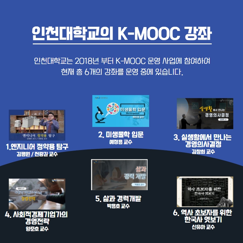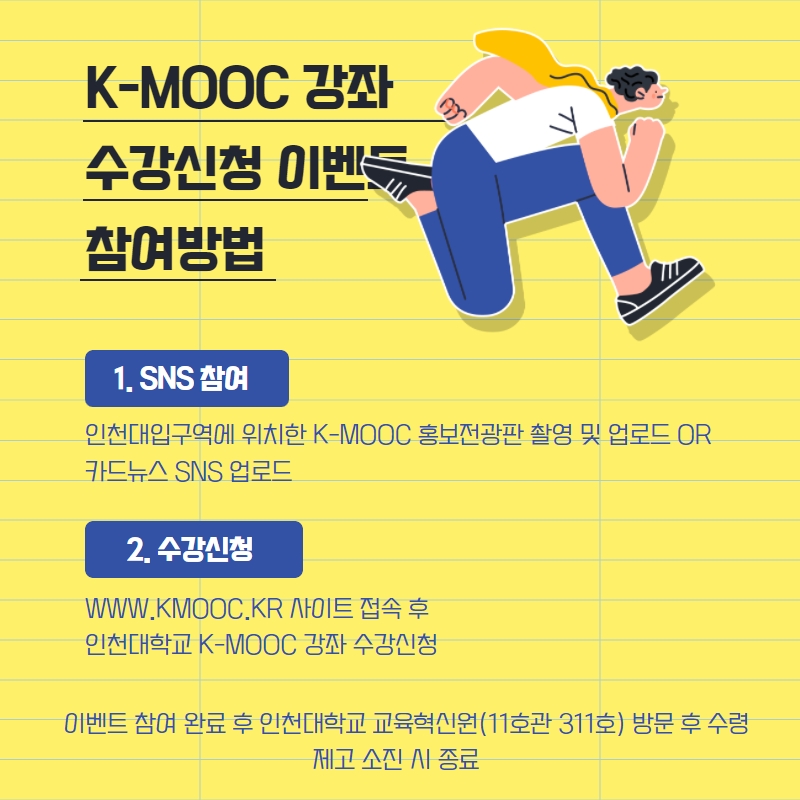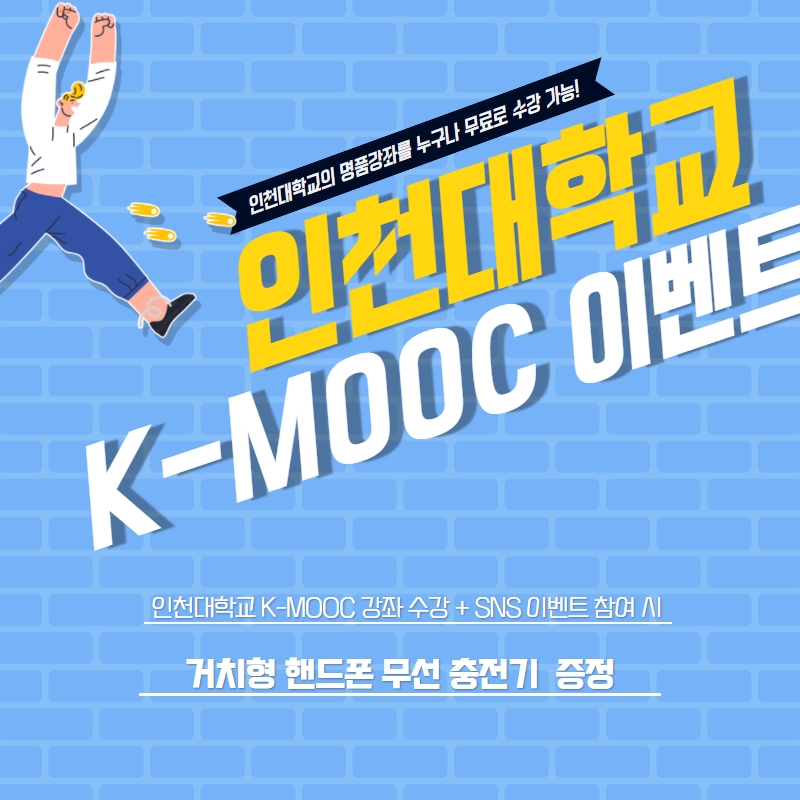 인천대학교 교육혁신원에서는 한국형 온라인 공개강좌(K-MOOC) 수강 이벤트를 진행하고 있습니다.