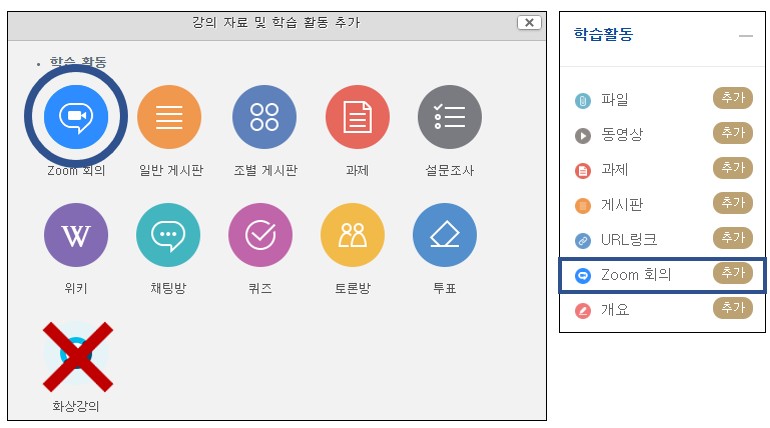 · 주차 내 학습활동 추가 시 [Zoom 회의] 사용 필수, 계정 신청 교원에 한하여 사용 가능